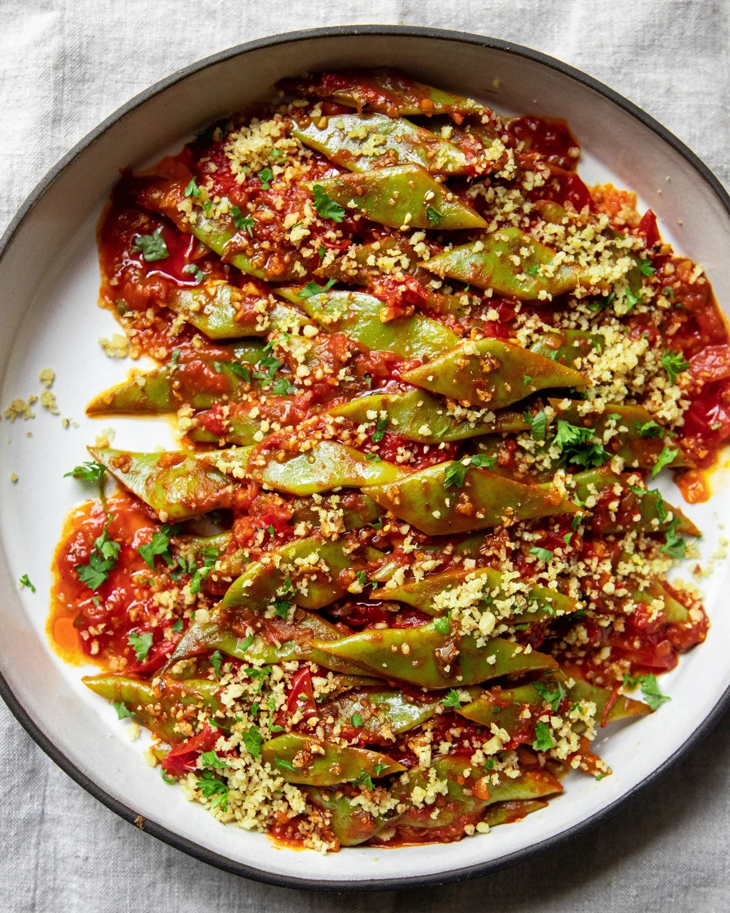 Once the Romano beans are done simmering, stir in the ½ teaspoon of tamari soy sauce. Check the dish for seasoning and adjust if necessary. Serve the braised Romano beans warm with the lemony walnut mixture and parsley sprinkled on top. Garnish with chili oil if you like.